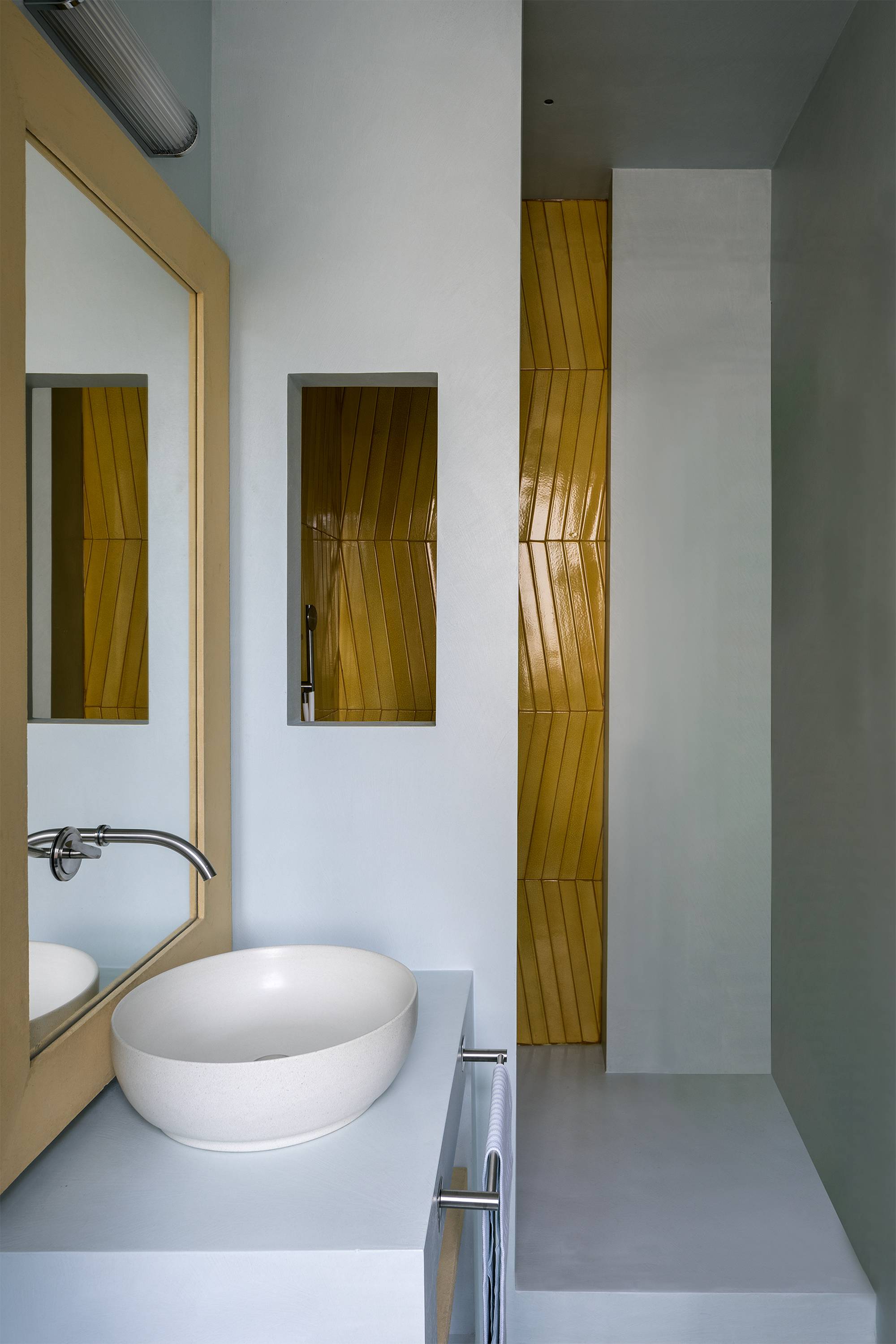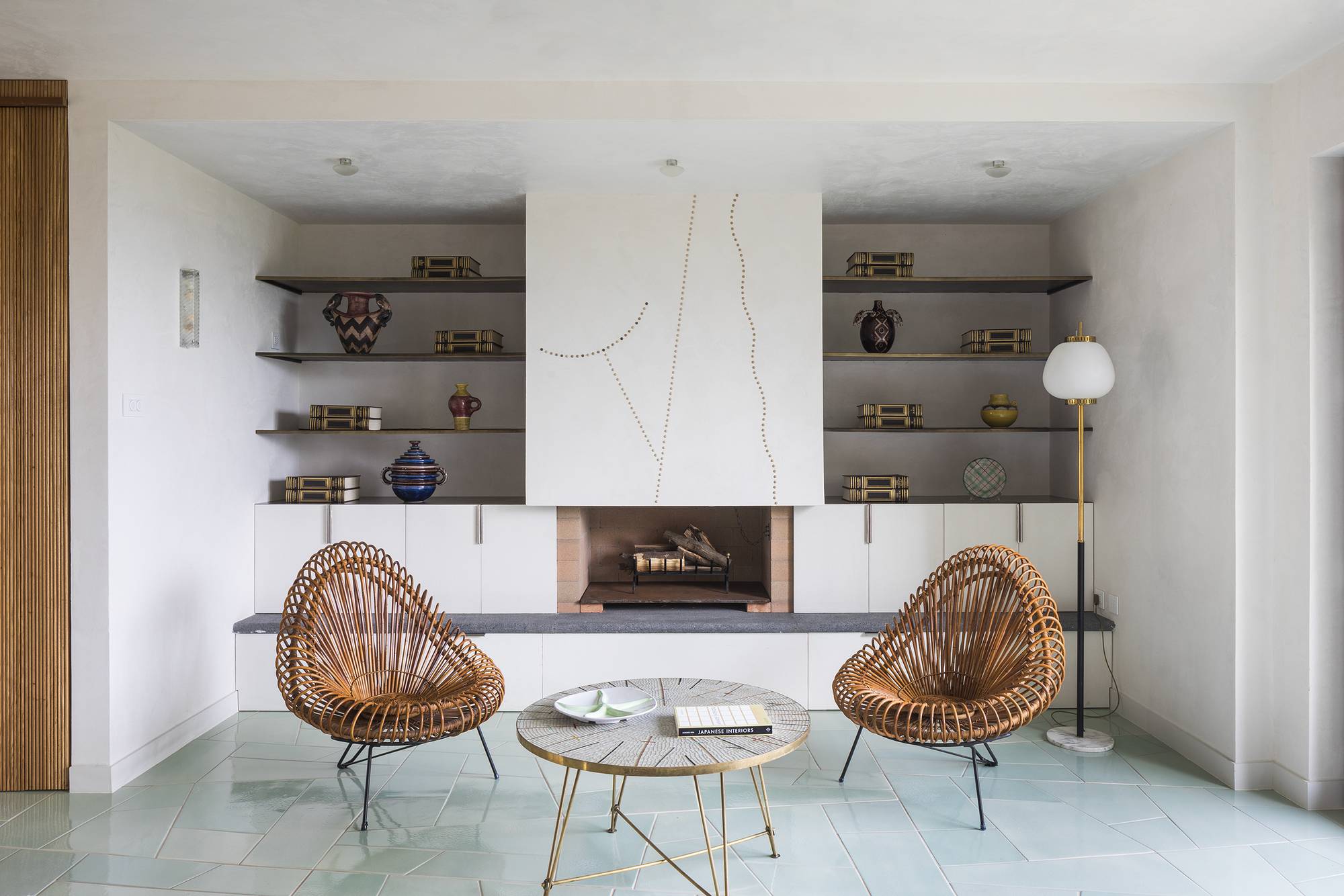 The celadon ceramic fragmented floor, handcrafted in Vietri, refers to the typical stone outdoor flooring, offering a continued feeling with the surrounding nature.
