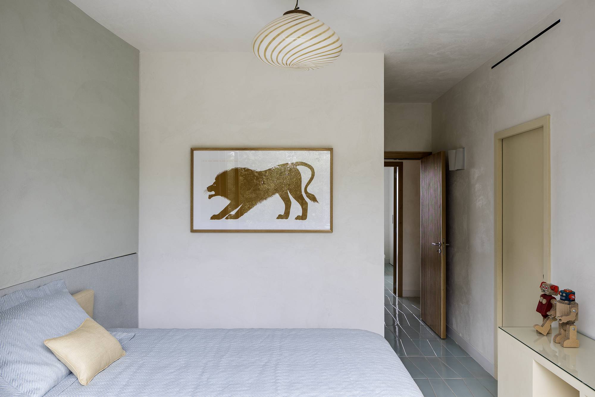 The ceramic on the upper floor features light blue colour and wavy shaped tiles, evoking the sea and the sky where you can feel bathed